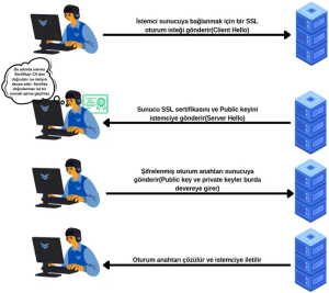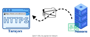 Kısaca Şekil 1’de de görüldüğü üzere SSL internet bağlantılarının güvenli olmasını sağlamaktadır. Kötü niyetli kişilerin iki uç sistem arasında aktarılan verileri açık bir şekilde okumasını engellemektedir. Tarayıcı üzerinde adres çubuğunun sol kısmında bir kilit simgesi bulunuyorsa bu sitenin SSL sertifikasının bulunduğu anlamına gelir.