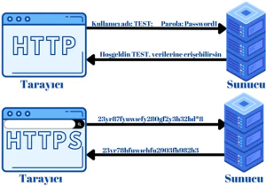 Şekil 2’de görüldüğü üzere HTTP ve HTTPS arasındaki fark şema üzerinde belirtilmiştir. HTTP ile yapılan iletişimlerde giden ve gelen veriler açık şekilde iletilmektedir. Fakat HTTPS iletişiminde ise giden ve gelen veriler şifreli şekilde iletilmektedir. HTTP iletişiminde araya giren kötü niyetli biri iletişimi okuyup değiştirirken HTTPS iletişiminde veriler güvenli olduğundan okunamaz ve manipüle edilemez. Kötü niyetli kişiler iletişimi engellese bile verileri okuyamamaktadır. HTTPS verileri SSL sayesinde şifrelemektedir.