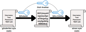 Simetrik Kriptografi: Şekil 3’te de görüldüğü üzere simetrik şifrelemede tek anahtar bulunur. Bu anahtar veriyi hem şifreler hem de şifreyi çözer. Örnek olarak kapı anahtarı verilebilir hem kapıyı kilitler hem de kilitli kapıyı açar. En yaygın kullanılan simetrik algoritmalar AES-128, AES-192 ve AES-256’dır.