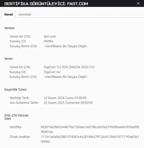 Şekil 7’de görüldüğü üzer bir SSL sertifikası bulunmaktadır. Bu sertifikanın doğrulanma sürecini ele alalım;