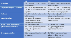 SSL ve TLS aynı amaca hizmet etseler de geçen bu sürede önemli değişikliklere tanık olmuştur. Bu değişikliklerin özeti tablo 1’de verilmiştir.